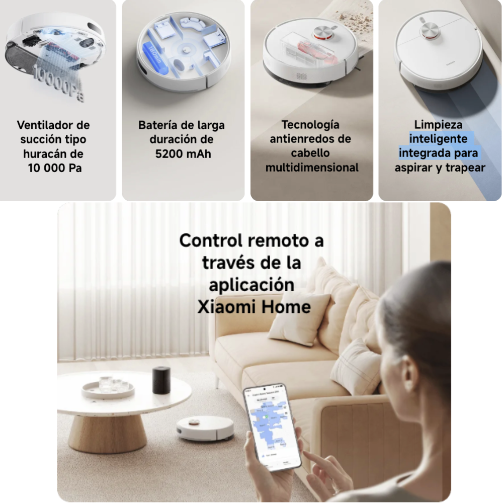 Puede limpiar pisos de cerámica, mármol, madera, e incluso alfombras de pelo corto. Su sistema LDS y succión de 10 000 Pa permiten una limpieza eficiente.
